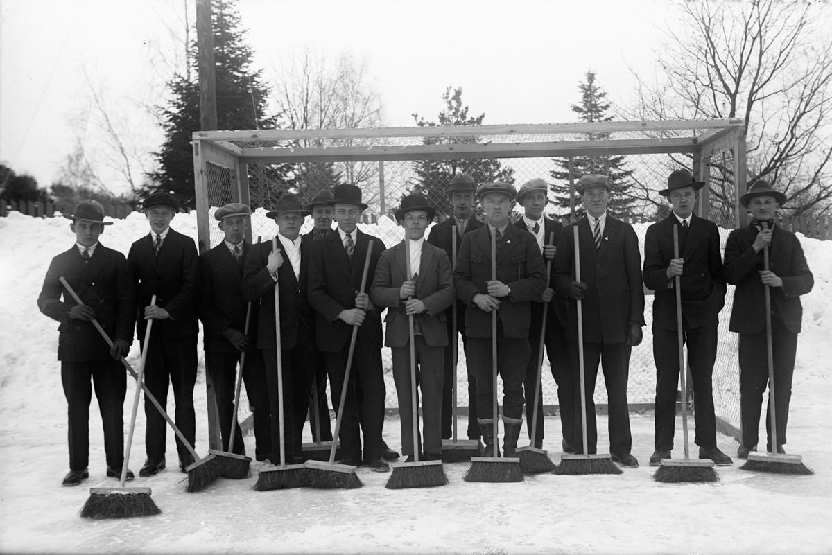 Jönköpings Stadspark. Män med kvastar i händerna framför ett fotbollsmål på Stadsparksvallen. Fr. v. Olof Magnusson (1), Olof Carlsson (2), Einar Karlsson (3), Kalle Pettersson (8), Ture Nyblom (9), Gustav Bergkvist (11), Torkel Larsson (12), Nils Blomberg (13).