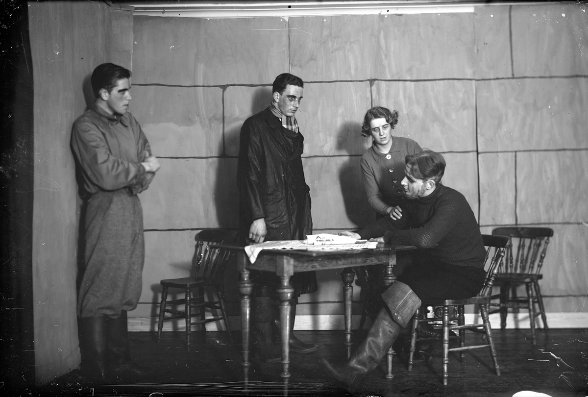 En man med skepparkrans sitter vid ett bord, en kvinna och två män, den ene klädd i regnrock, står vid ett bord. I bakgrunden finns en imiterad stenvägg.