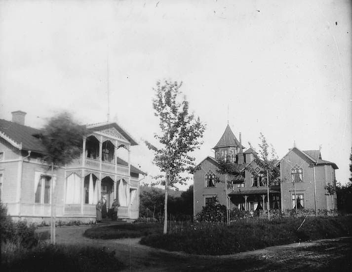 Människor står på trappan till det ena huset i Jönköping, kanske familjen Ulfsparre.