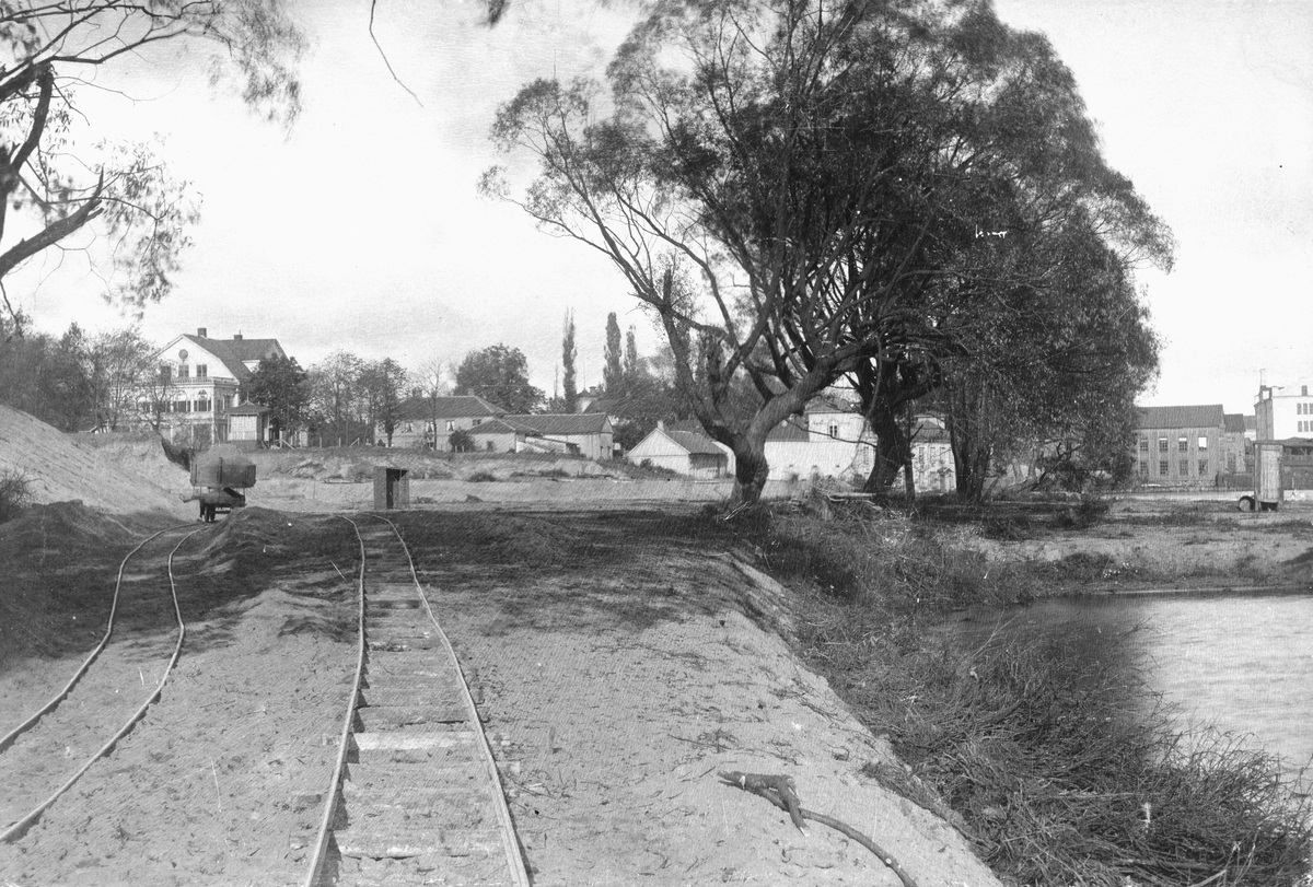 Bortschaktningen av sandbanken nedanför Mariedal i Jönköping under 1894 för Vaggerydsbanans framdragande. Stora Limugnen, Lilla Limugnen, delar av Sandwalls mekaniska verkstad och länsfängelset syns i fonden.
