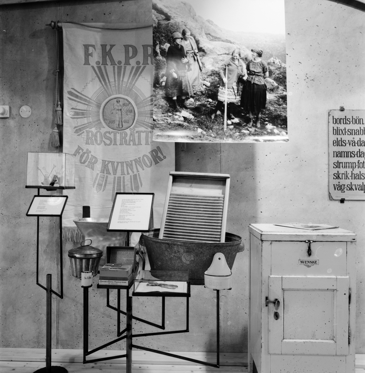 Utställning Tiotusen år. Utställningsdelen Hushåll bland annat finns här Tvättbräda, balja och burk för såpa. Isskåp från Tenhults herrgård.