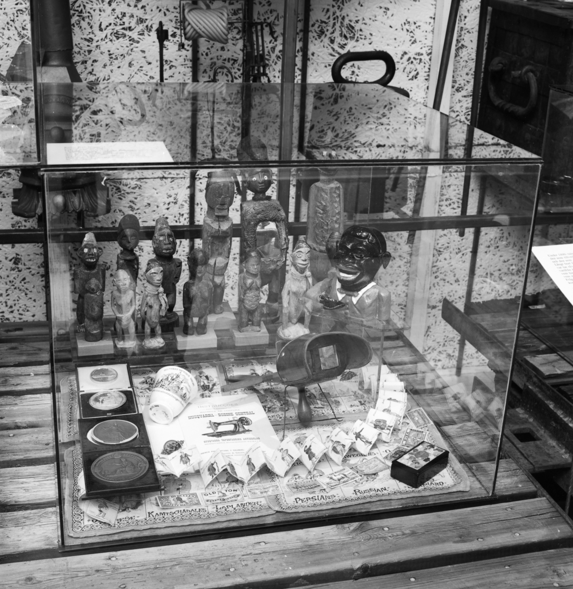 Utställning Tiotusen år. Glasmonter i utställningsdelen "Tågvagnarna", i glasmontern finns det bland annat statyetter från Kongo och olika medaljer. Stereoskop av trä, sparbössa "Lille Svarte Sambo" tändsticksetiketter.