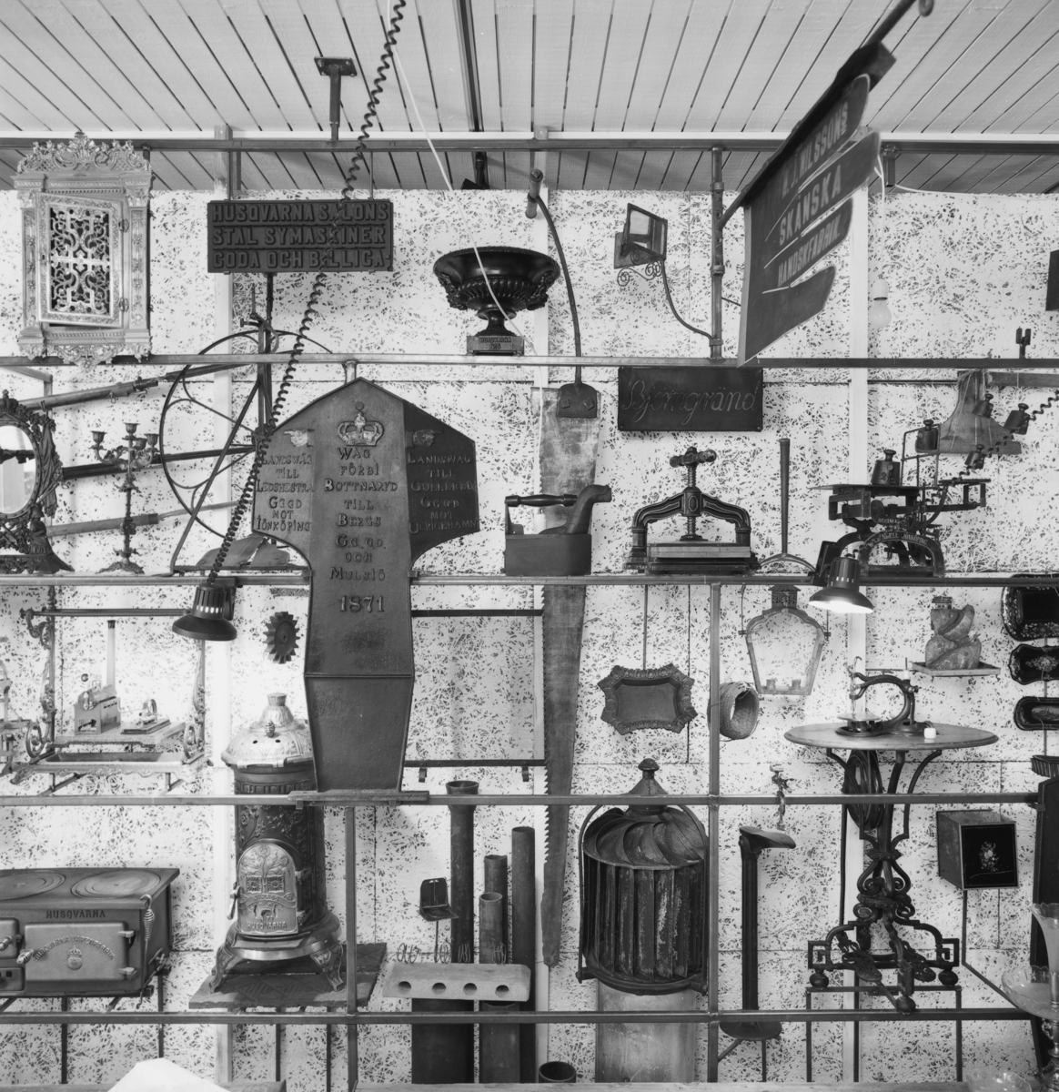 Utställning Tiotusen år. Utställningsdelen Järnväggen. Milstolpe med text 1/4 Mil mo härad 1871 med Carl xv:s namnchiffer. Gatuskylt från Björngränd i Jönköping. Trädgårdsurna tillverkad av Huqvarna AB.