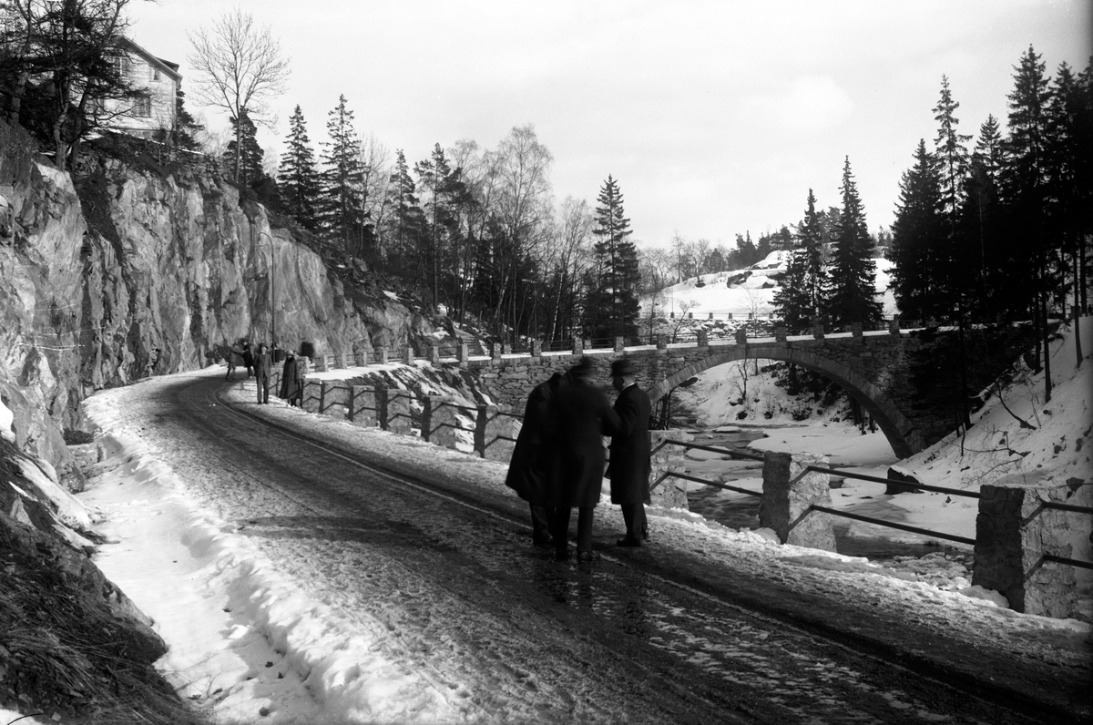 Ådalsvägen i Huskvarna, vid nedre bron med ett bostadshus uppe på bergskanten.