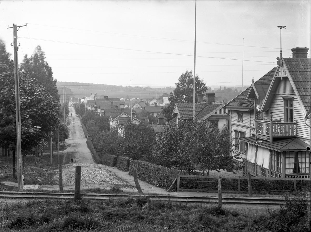 Rosenborgsgatan i Huskvarna år 1910. Tvåvåningsvillor i trä ligger utmed den trädkantade vägen och häckar inramar trädgårdarna. I förgrunden syns järnvägsspår.