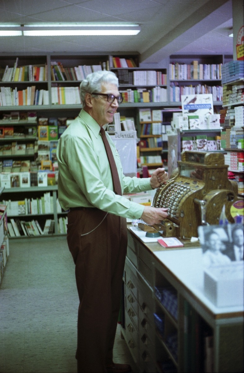 Allan Mollberg står vid kassaapparaten i Rydheims Bokhandel på Drottninggatan i Huskvarna.