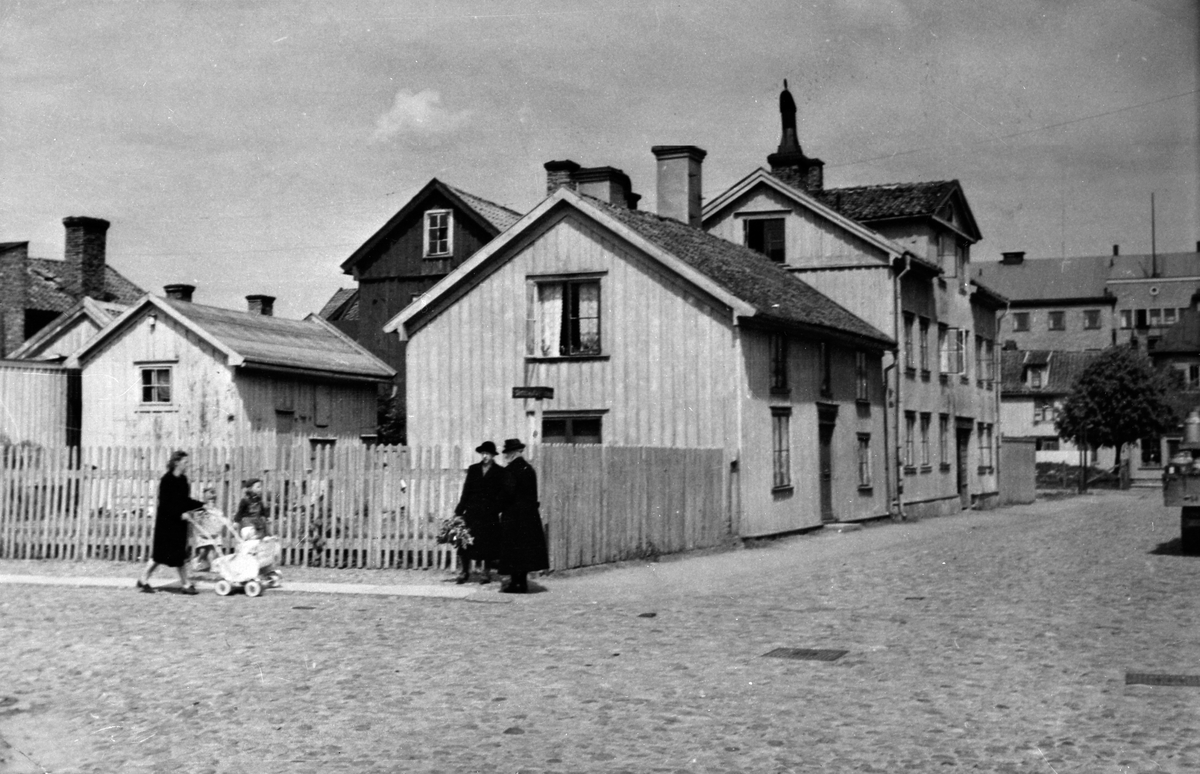 En mamma med tre barn och två äldre kvinnor möts utanför husen vid en kullerstensgata.