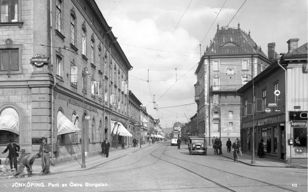 Östra Storgatan i Jönköping, fotograferad från Vindbron. Till vänster Stora hotellets byggnad med Handelsbankens lokal på hörnet och med reklam för Pratts bensinstation och Karnells tobaksaffär. Det höga huset till höger var Smålands enskilda bank och i trähuset låg Lilla hotellet.