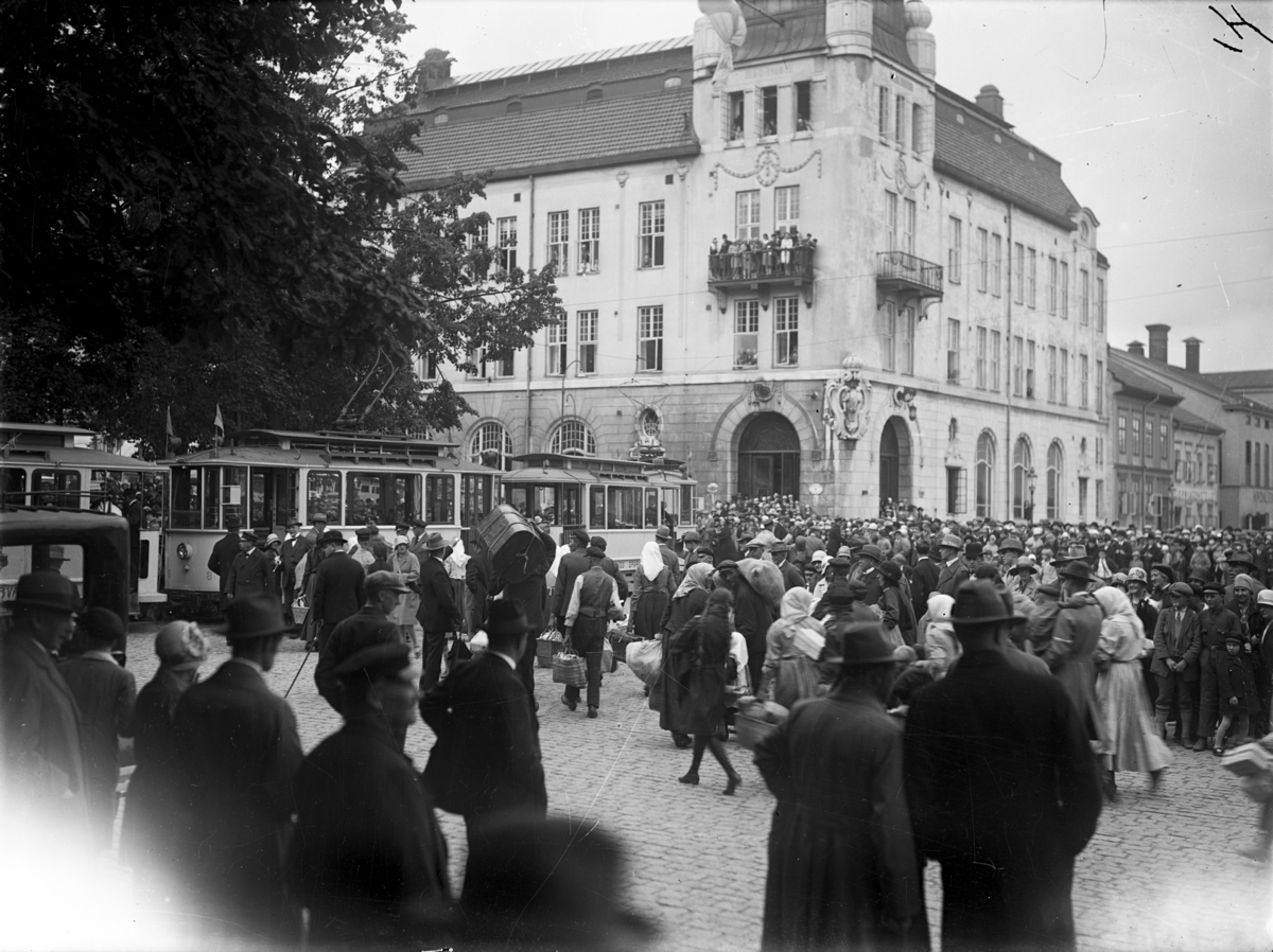 Svenskbyborna som anlänt till Jönköpings station med två chartrade tåg fredag 2 augusti 1929 åker vidare med spårvagn och bilar från Järnvägsparken upp till Ryhovs kasernområde för inkvartering.
