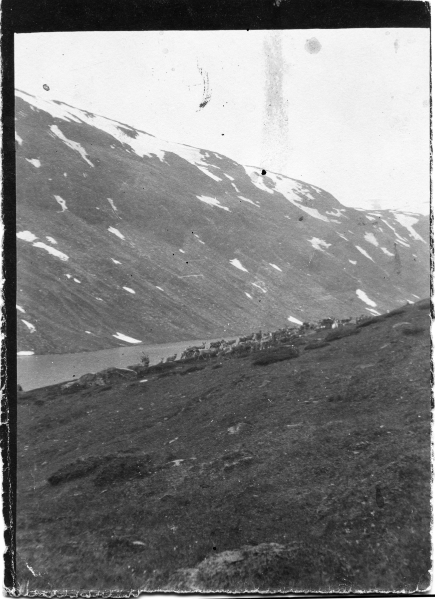 John Bauers Lapplandsresa sommaren 1904. Vy över sjön vid Kårsajökeln, norra sidan av Håikantatjåkka och renar på fjällsluttningen.