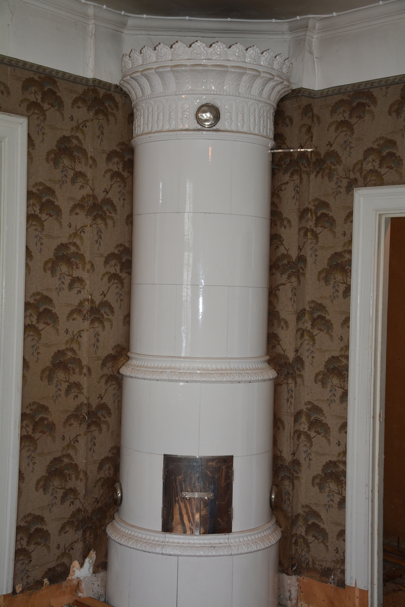 Interiör med kakelugn och äldre tapeter från byggnad i Mariannelund, i Eksjö kommun