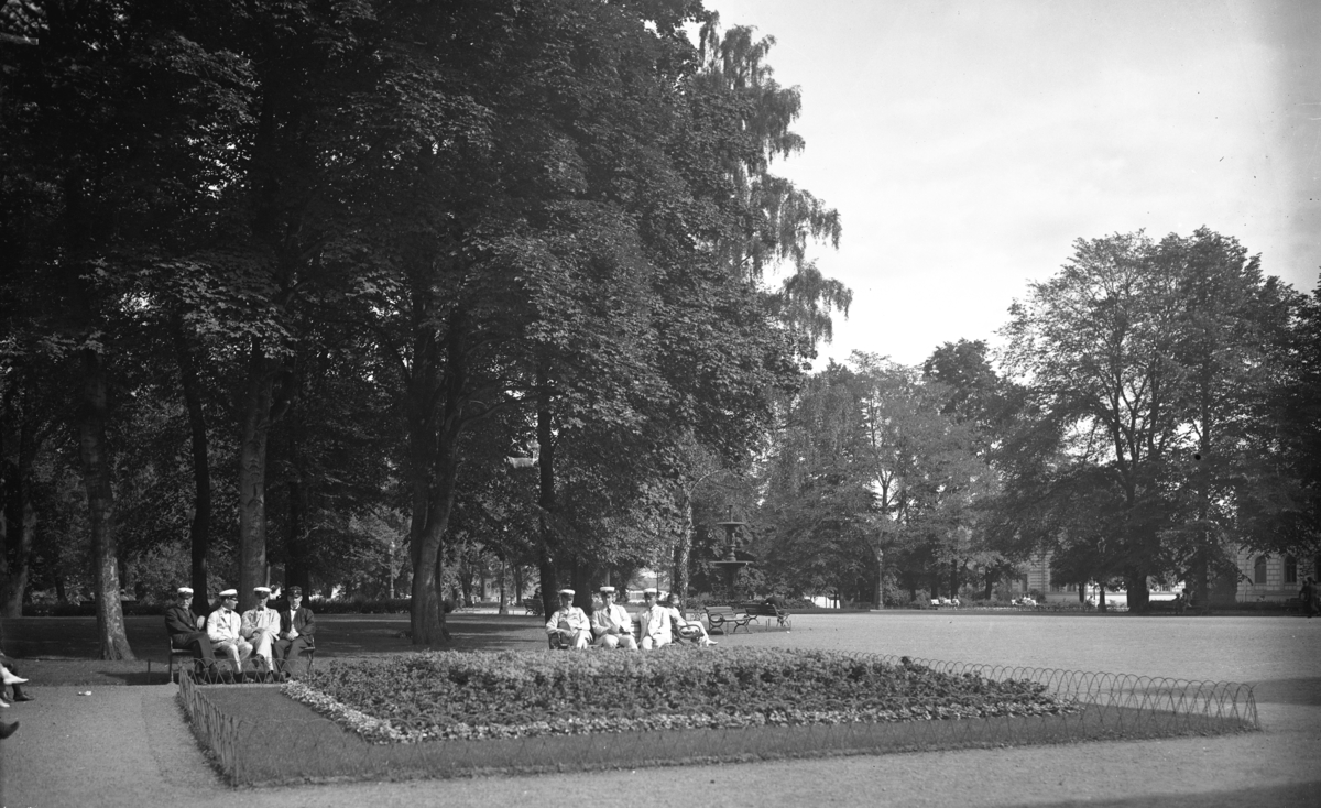 På bänkarna i Rådhusparken i Jönköping sitter några ynglingar med studentmössor. I bakgrunden skymtar Riksbankens hus.
