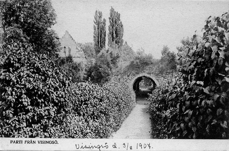 Vykort från Visingsborg slottsruin på Visingsö med porten genom vallgraven. Text på kortet: "Visingsö 3/8 1907".