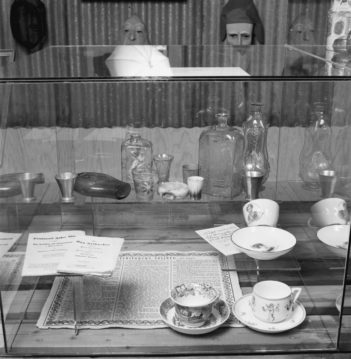 Utställning Tiotusen år. Utställningsdelen Tågvagnarna, glasmonter 5:4. Flaskor, koppar med fat, tennbägare.