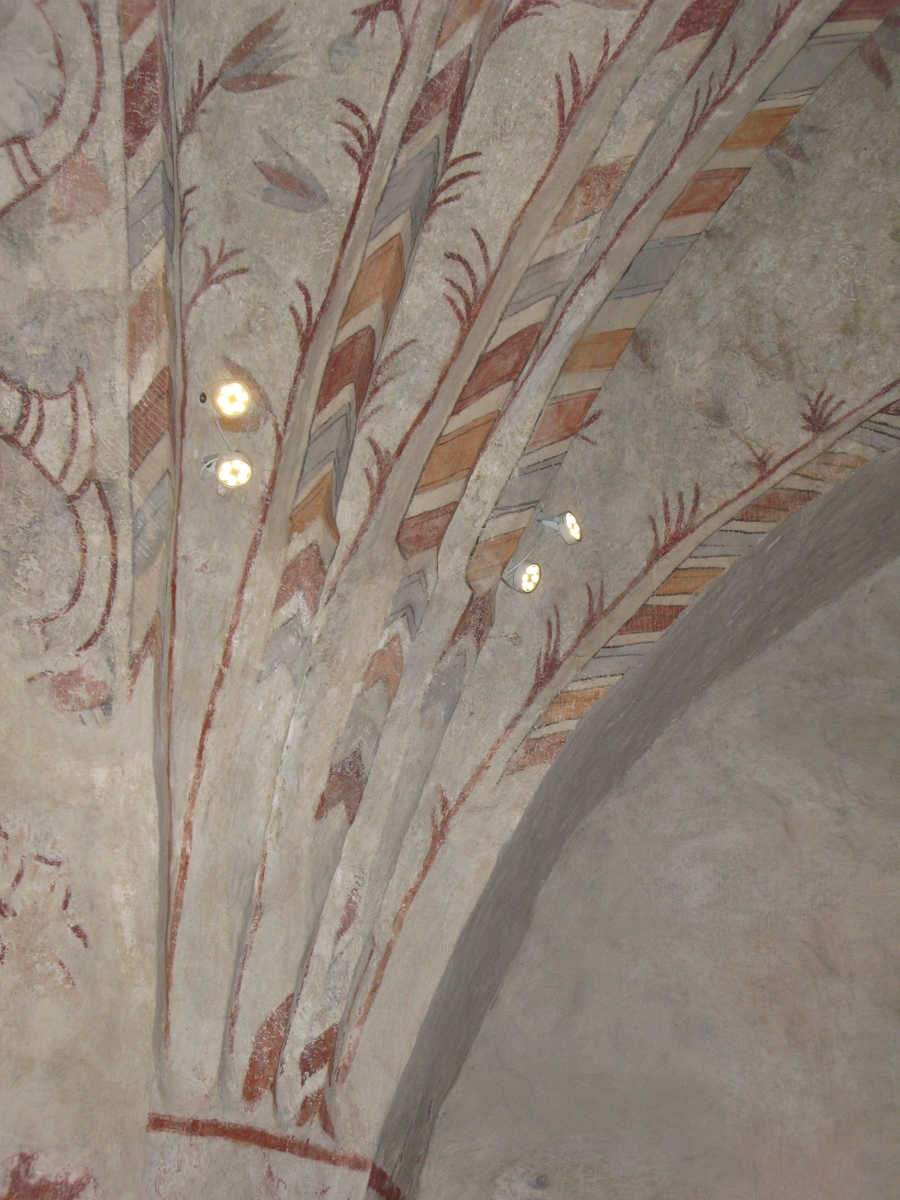 Interiör från Säby kyrka i Säby socken, Tranås kommun. Bilden visar ny led-belysning i triumfbågsvalvet.