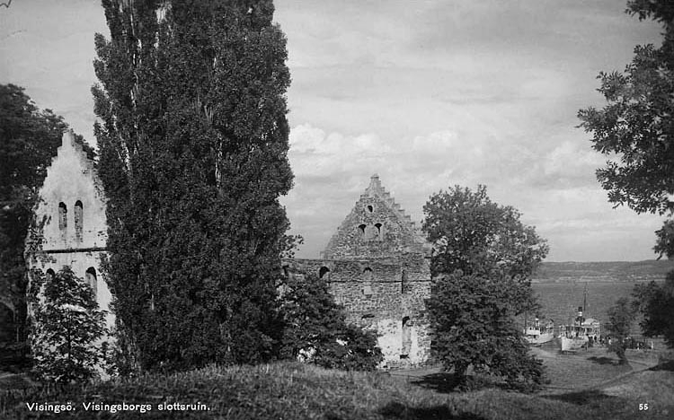 Visingsborgs slottsruin på Visingsö. Nere i hamnen har passagerarfärjan lagt till.