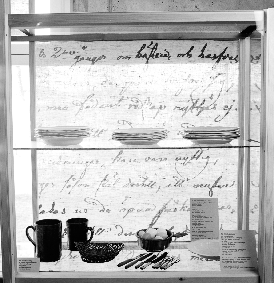 Utställning Tiotusen år. Glasmonter i utställningsdelen Bondesamhället från 1800-talet. På översta hyllplanet Porslintallrikar, på nedre hyllplanet stop av lergods, bestick och skålar.