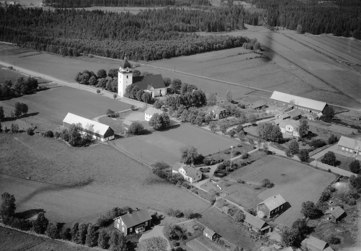 Flygfoto över Alseda i Vetlanda Kommun och på bilden ser man även Alseda Kyrka, Jönköpings län. Nr: 1021/1961