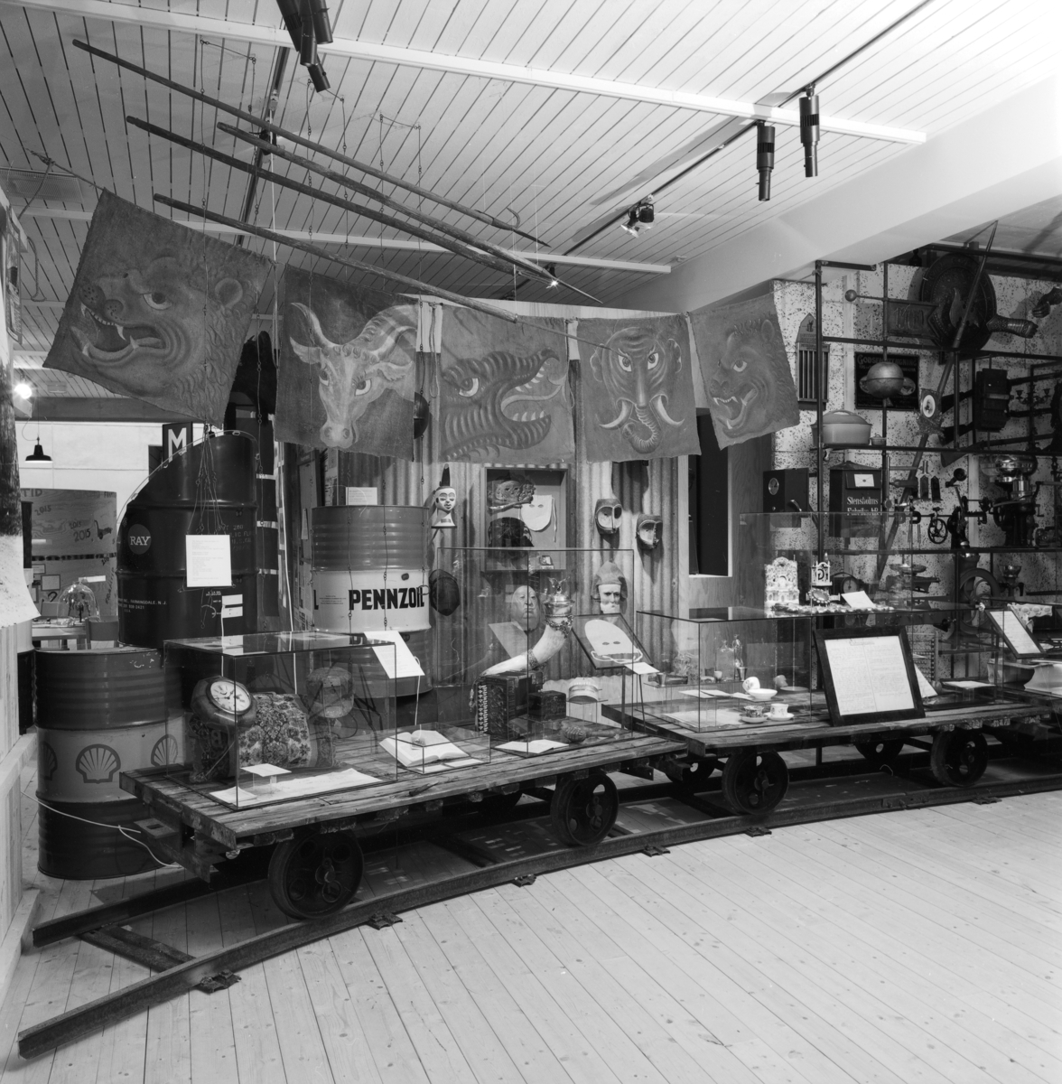 Utställning Tiotusen år. Glasmontrar med föremål vid järnväggen. Den första glasmontern 6:3 till vänster innehåller Amerikaväska s.k. Hemlängtan och en klocka, ett skeppsur på baksidan står det Ansonia, Connecticut, USA 1868. Ovanför hänger det i taket "jaktlappar"