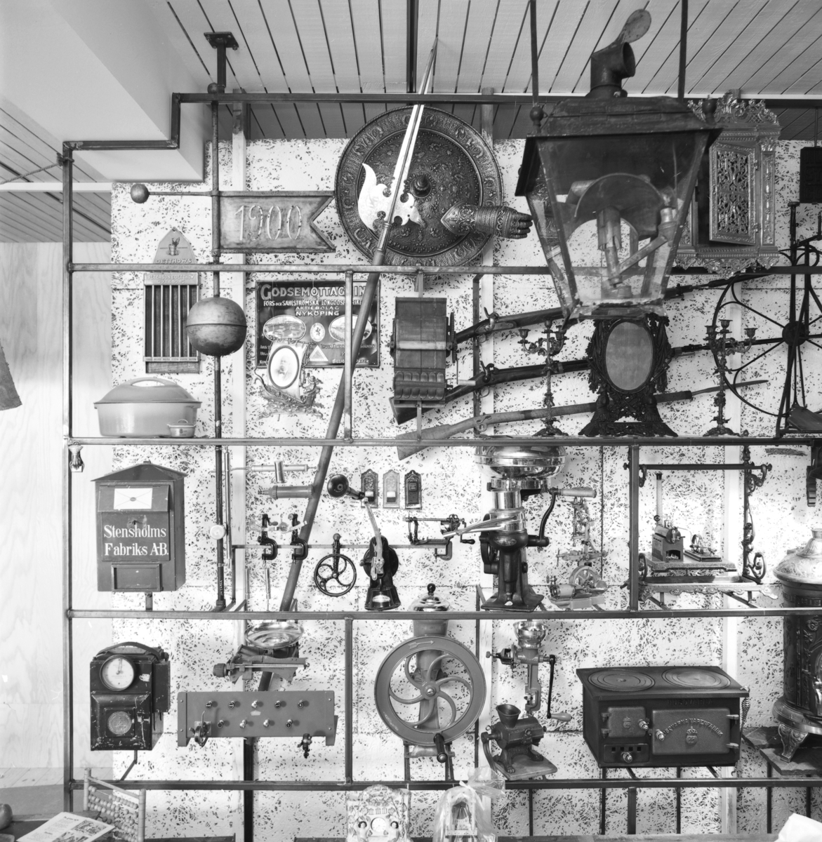 Utställning Tiotusen år. Utställningsdelen Järnväggen. Föremål på väggen längst ner till vänster stämpelur från linnefabriken i Jönköping, vindflöjel daterad år 1900, stekgryta av emaljerat järn tillverkad av Husqvarna AB, Gevär, Gatulykta för rovolja har använts i jönköping på 1800-talets första hälft. sköld, brevlåda Stenholms fabriks AB.