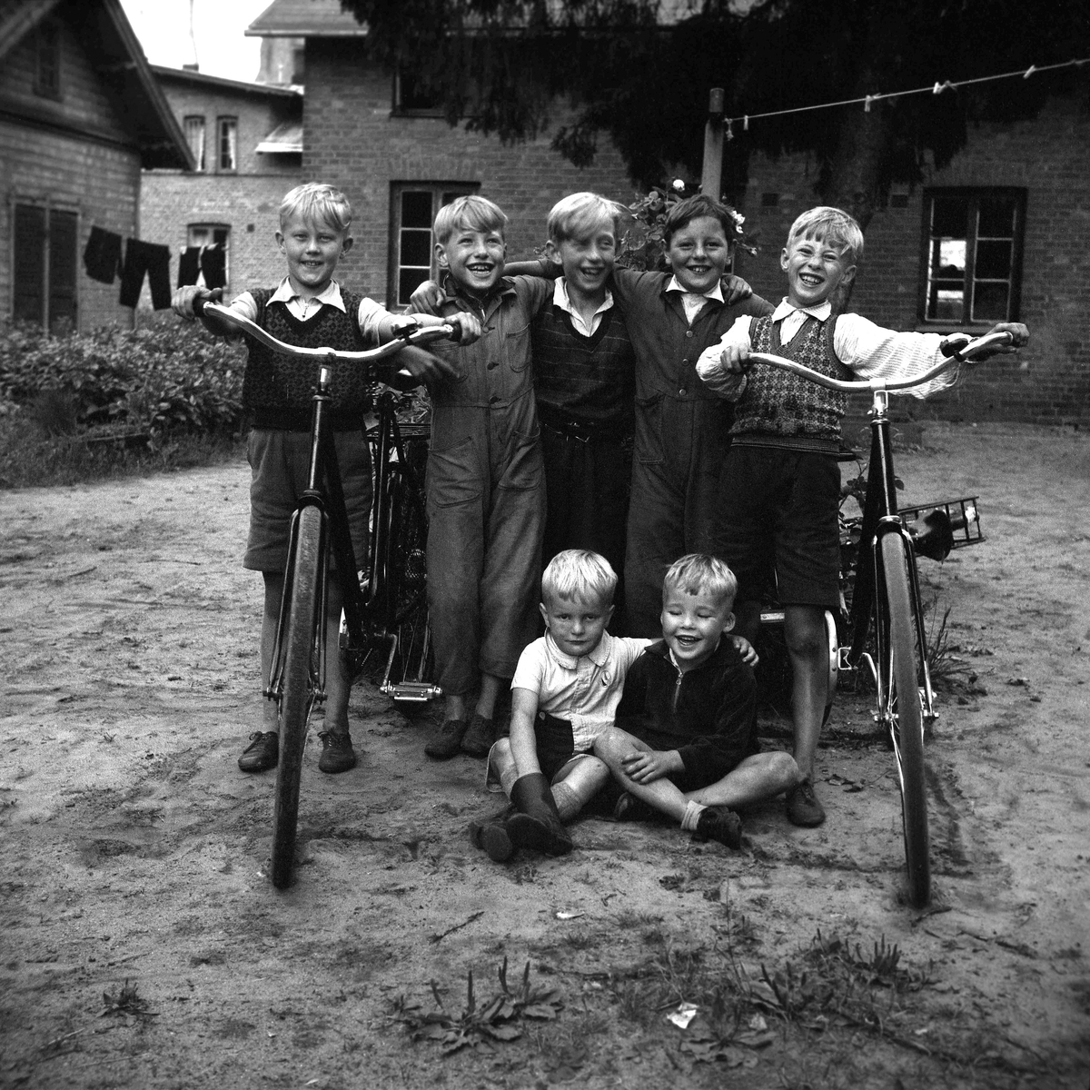 Sju pojkar med två cyklar utanför "Bostäderna" vid Västra torget i Jönköping. Pojken som sitter nere till höger är Claes-Göran Carlsson (f ca 1938), som bodde i Bostäderna. Stående som tvåa och femma från vänster är båda hans bröder.