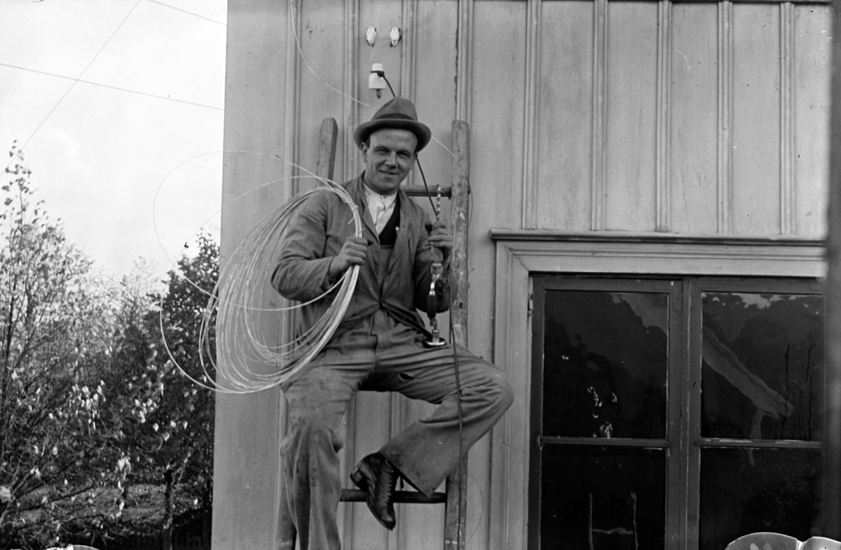 Gunnar Svensson, på en stege med ledningstråd på axeln vid ett hus på Barnarpsgatan. Han hade egen elektrikerfirma, EMA. I ungdomsåren var han en av fotograf Gustav Anderssons närmsta vänner och bodde i förmanshuset på Pilgatan 16 i Jönköping.
