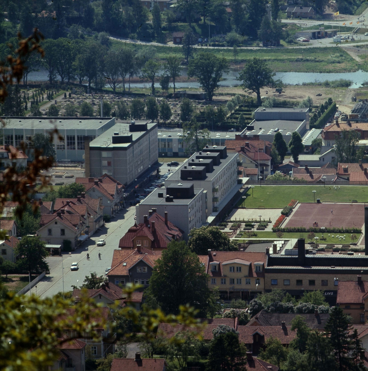 En vy över Huskvarna stad med utsikt över Rosenborgsgatan. År 1950-1960 talet