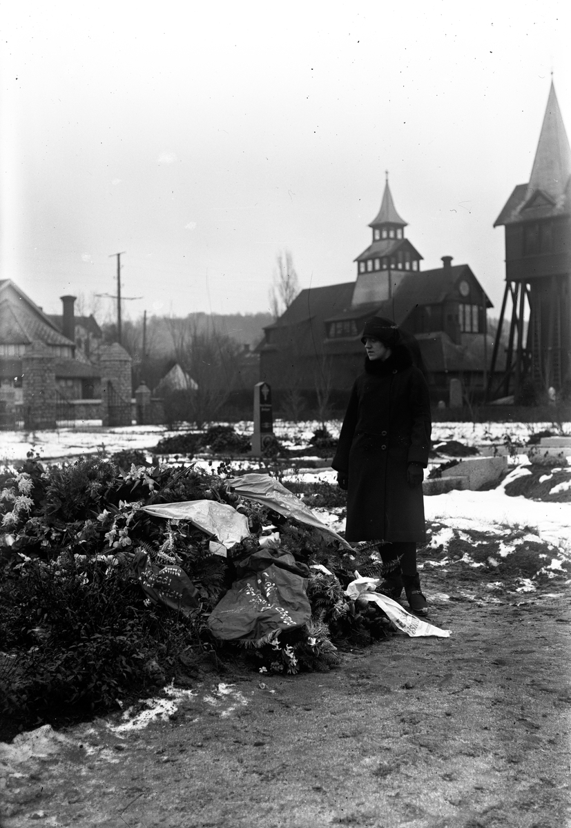 En ny grav på kyrkogården i Huskvarna. Ovanpå ligger de sörjandes blommor med en sista hälsning skriven på banden. En kvinna står bredvid och i bakgrunden syns kyrkan.