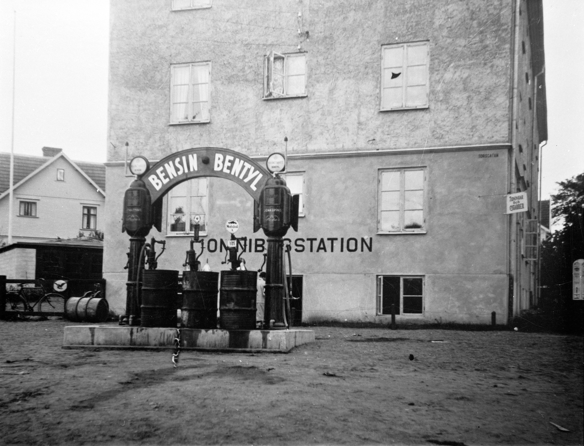 Omnibusstationen på Torsgatan i Huskvarna. Man kan tanka bensin och bentyl ur pumparna och enligt skylten på huset kan man också köpa tidningar och cigarrer.