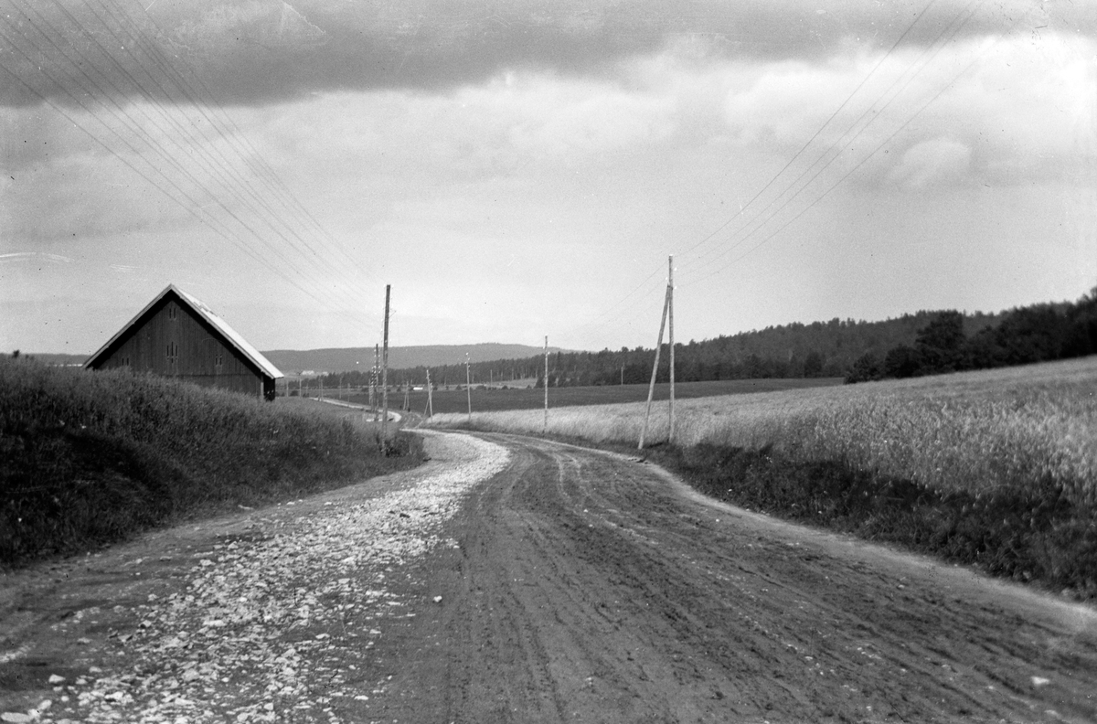 Genom jordbrukslandskapet slingrar sig en väg förbi en lada.