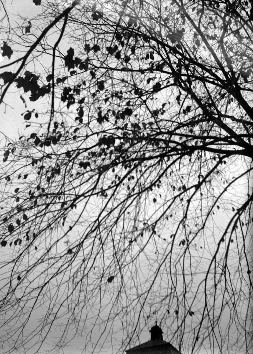 En nästan avlövad trädgren hänger ner framför ett torntak, kanske en kyrka.