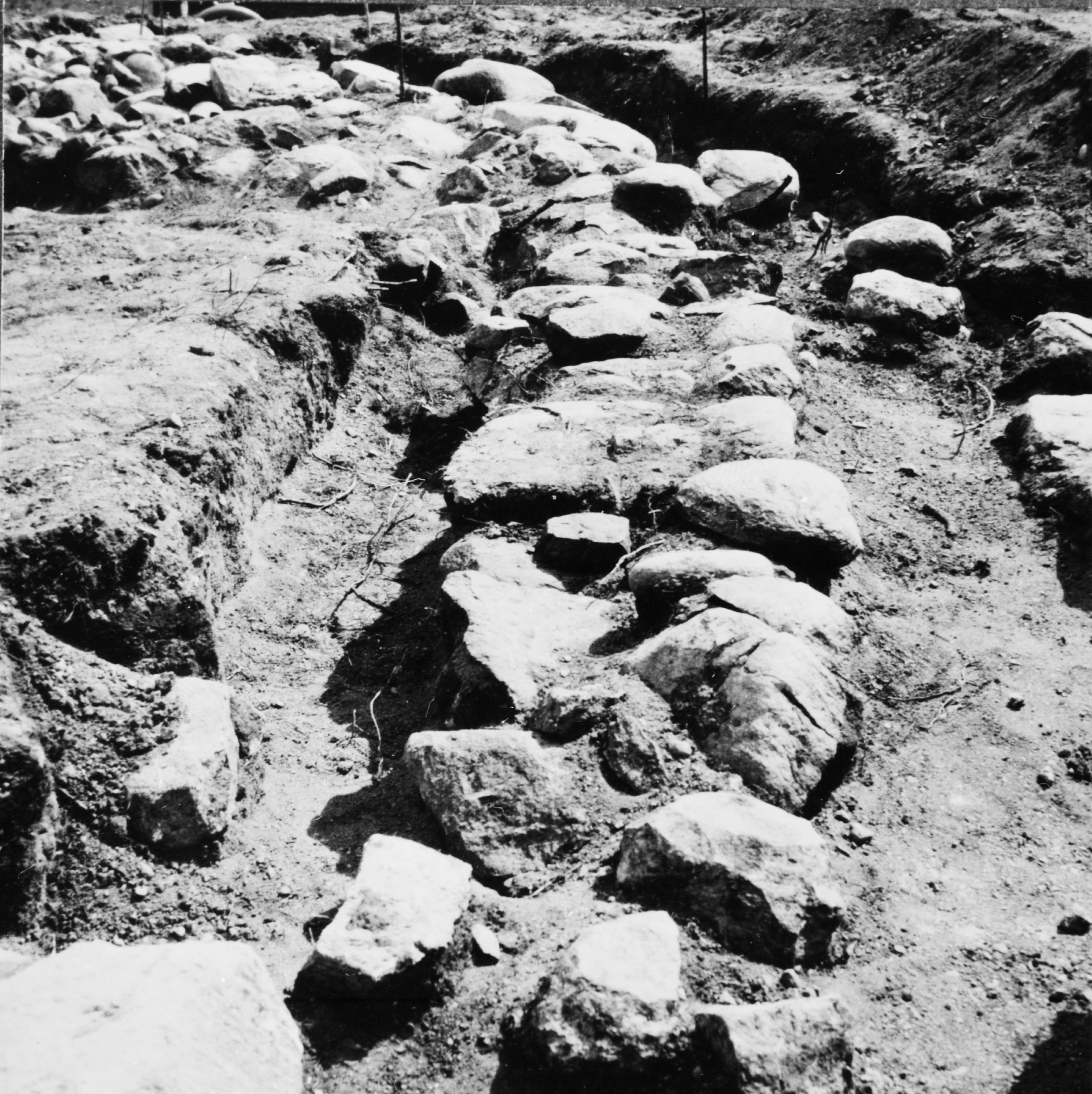 Kyrkans grundmurar under utgrävning. Sydmuren från väster. Mitt på muren stampat lergolv.