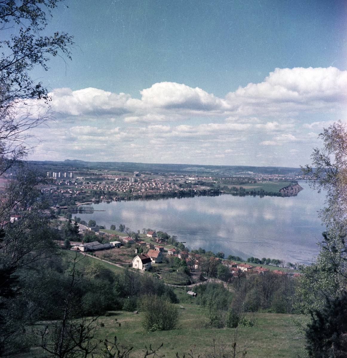 Vy över Huskvarnabukten, Vätternäs och Sanna. I bakgrunden syns Rosenlund och Elmiaområdet vid sandbankarna.