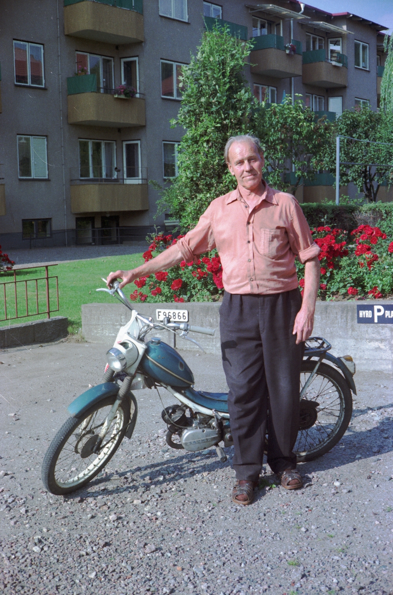 Sten Gyllensten står vid sin moped på parkeringen vid Stjärnköp på Drottninggatan i Huskvarna.