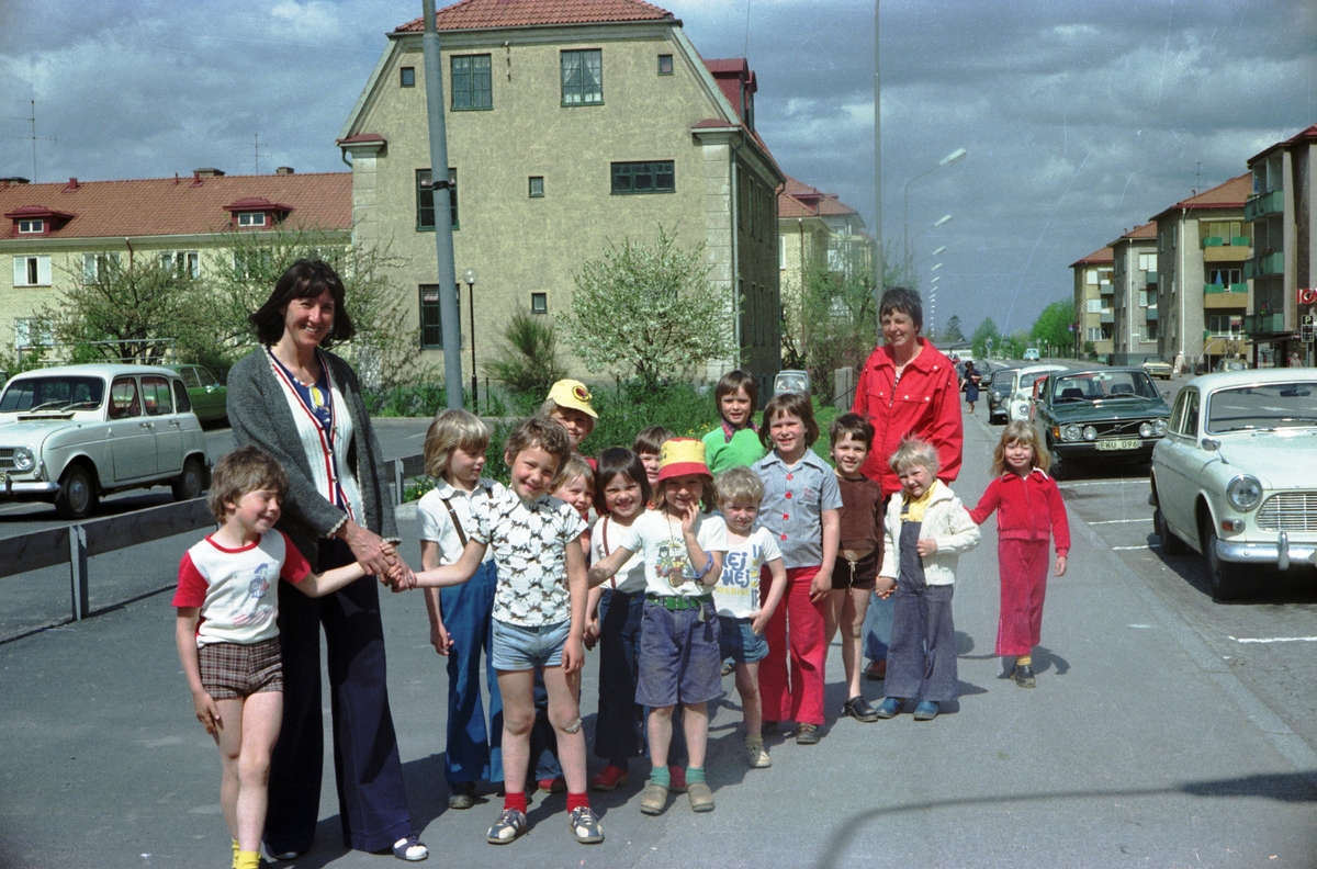 En grupp barn med två vuxna är på promenad utmed Drottninggatan i Huskvarna.