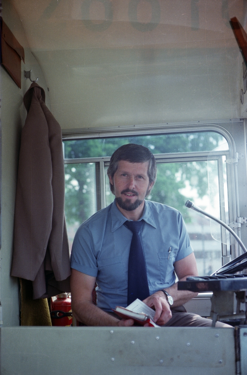 Busschaufför Rolf Ullman i en buss av märket Scania-Vabis Capitol CR 76 i Huskvarna.