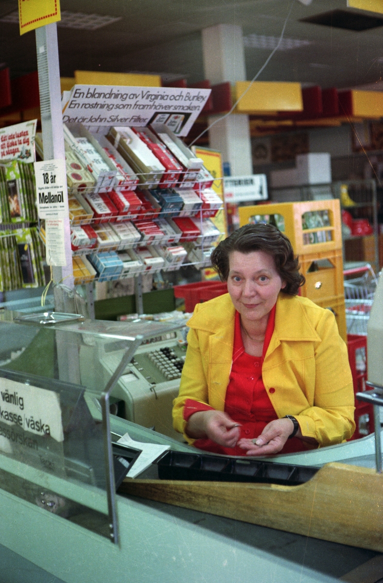 En kassörska vid BRA Stormarknad räknar pengar i kassan.