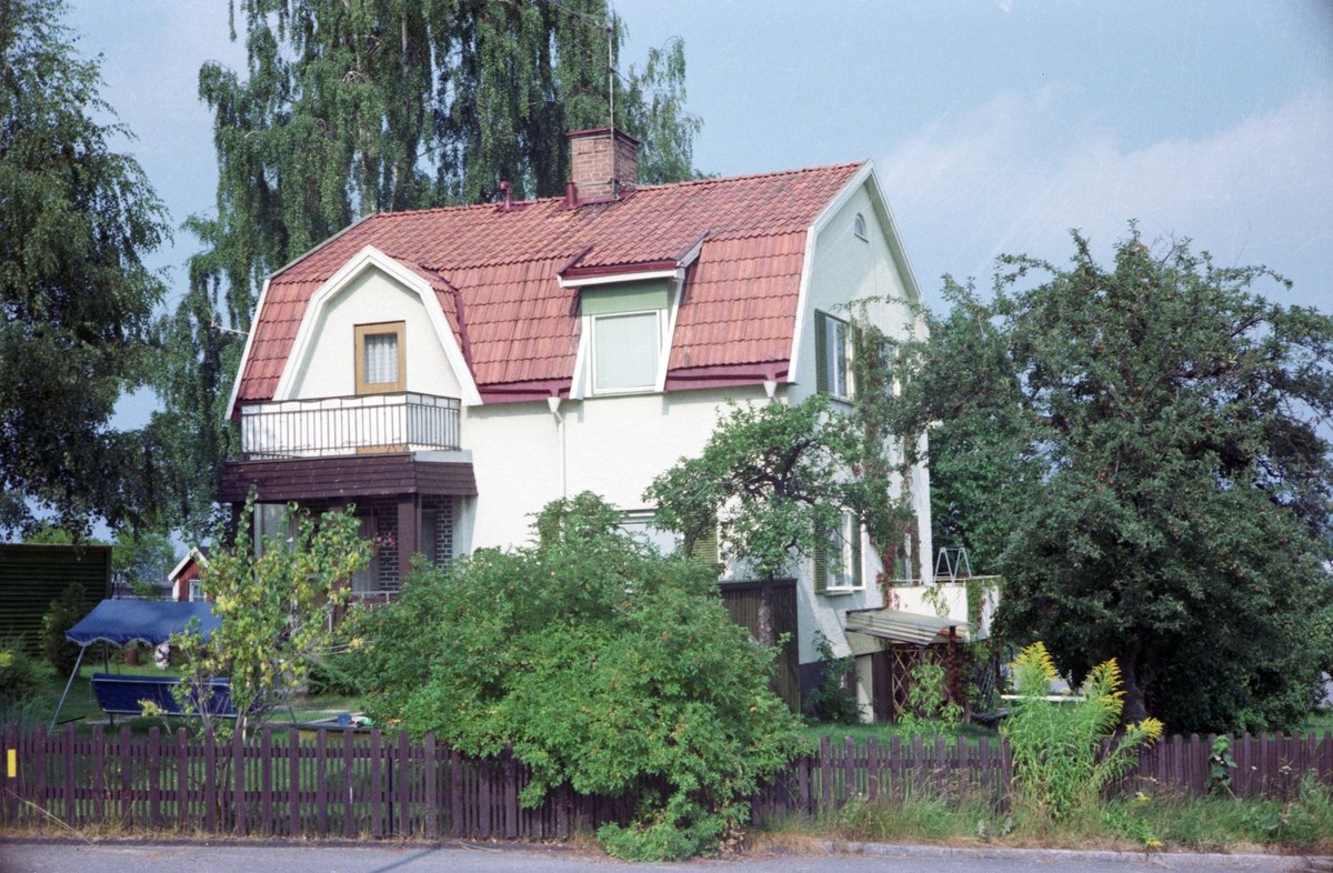 Ett bostadshus i Huskvarna. På tomten står en hammock bredvid sandlådan.