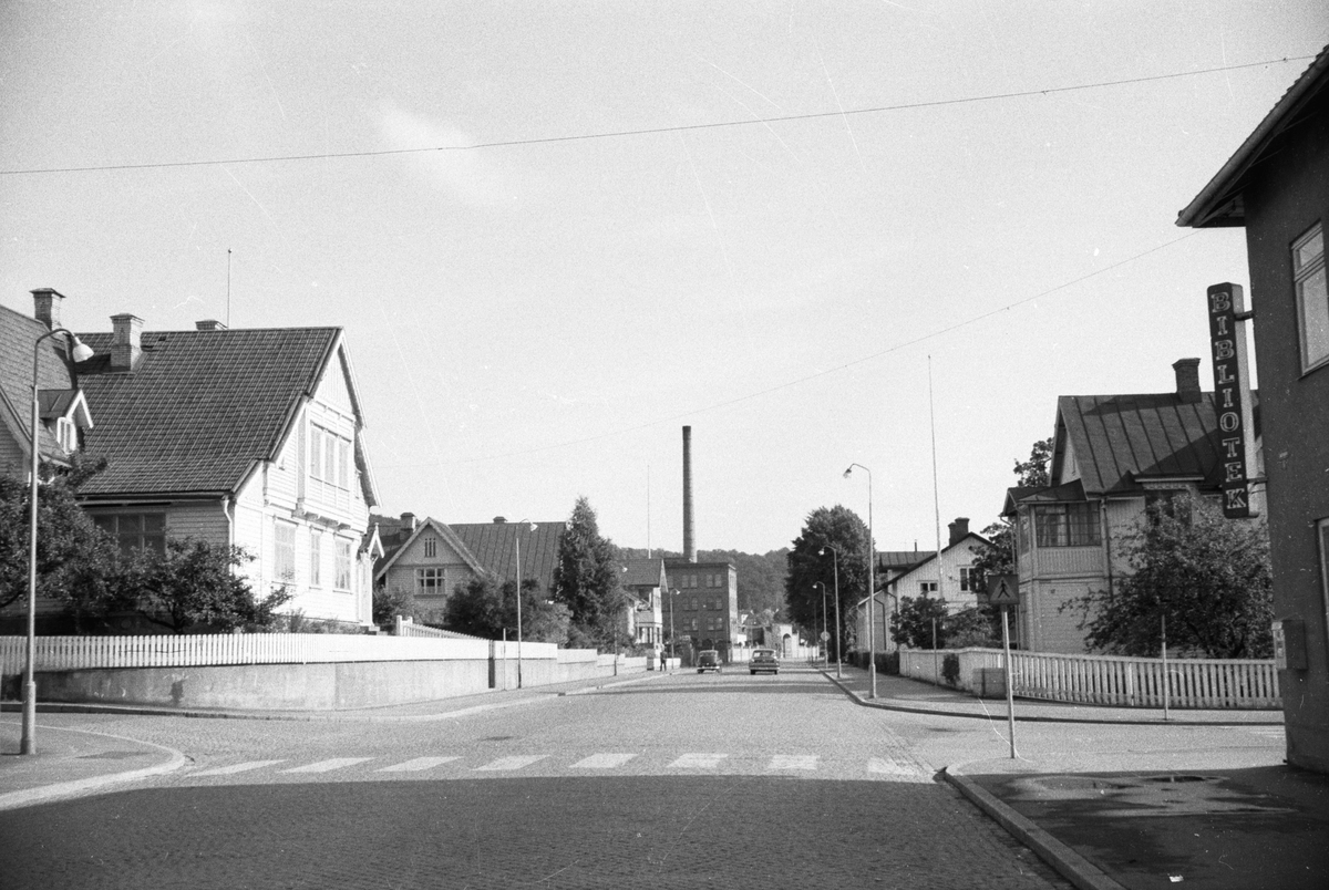 Drottninggatan med skorstenen vid Husqvarna AB rakt fram. I huset till höger finns Biblioteket.