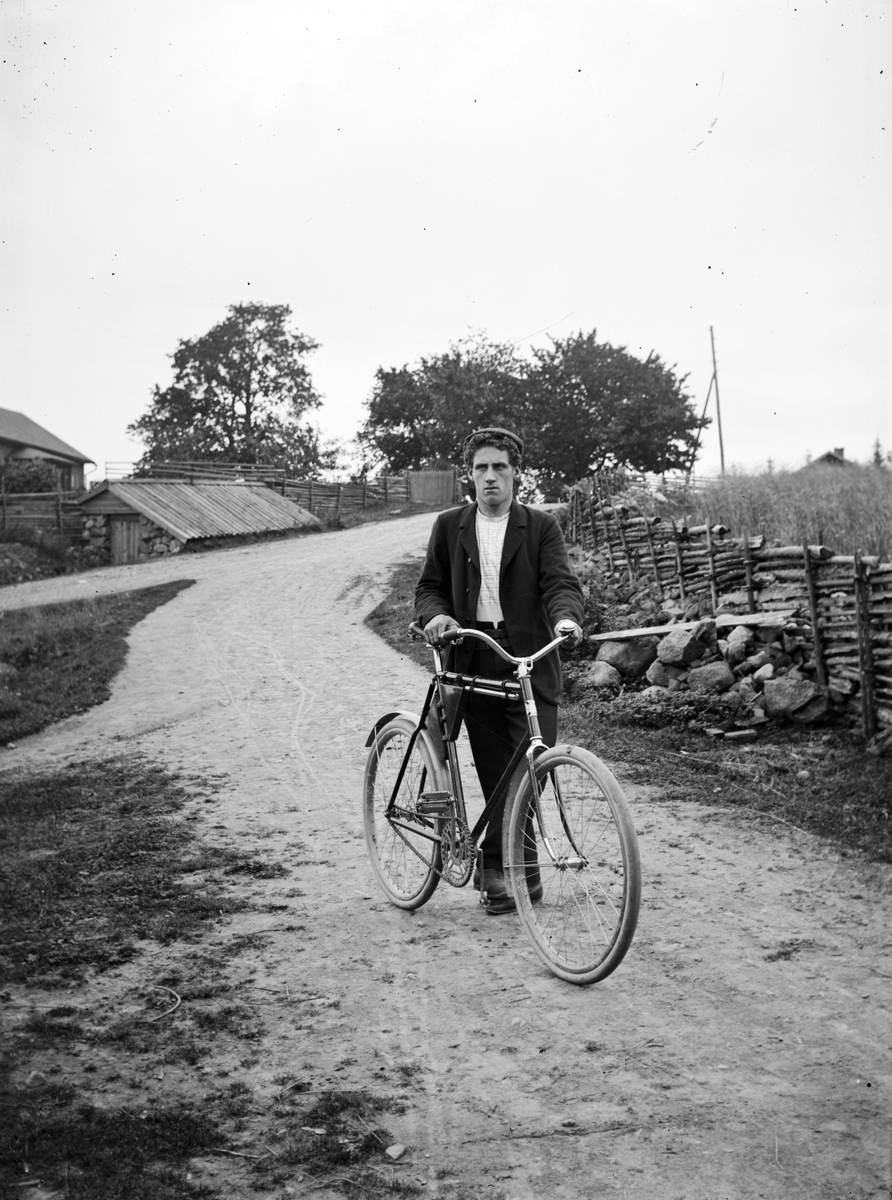 En man med sin cykel på en väg i Ökna socken, Vetlanda.