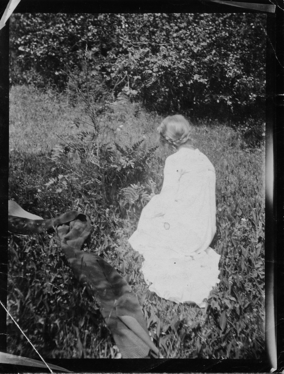 Ester Bauer plockar blommor på en äng, i handen håller hon liljekonvalj.