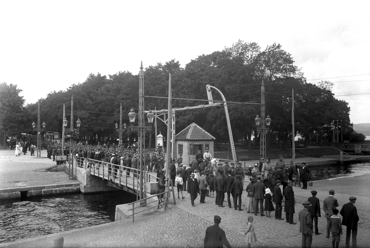 En trupp soldater marscherar över Vindbron i Jönköping och i täten rider några militära befäl. En polis med sabel övervakar paraden.