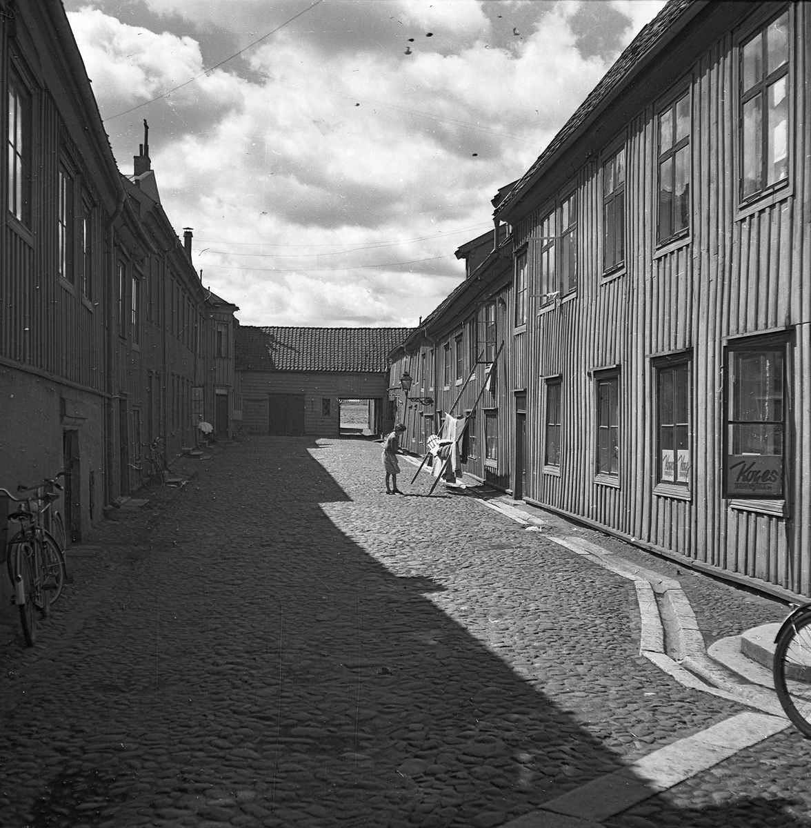 En kullerstensbelagd bakgård i Jönköping. På en ställning lutad mot huset hänger en kvinna upp sängkläder för vädring. I fönstren närmast till höger finns Koges dekorationsateljé som låg här år 1941-1955