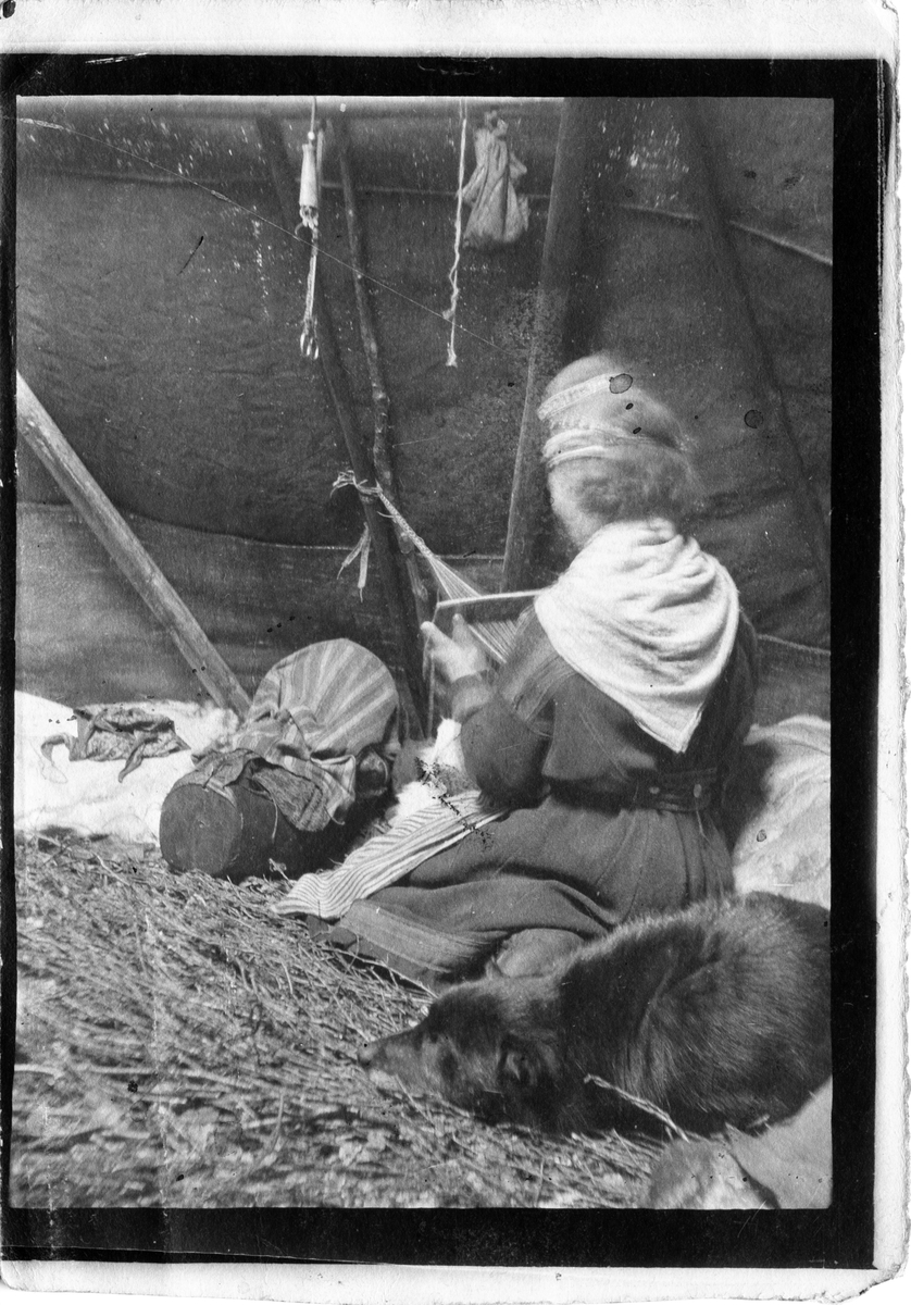 John Bauers Lapplandsresa sommaren 1904. I en kåta sitter en kvinna och väver ett band. Bakom henne ligger hunden och sover.