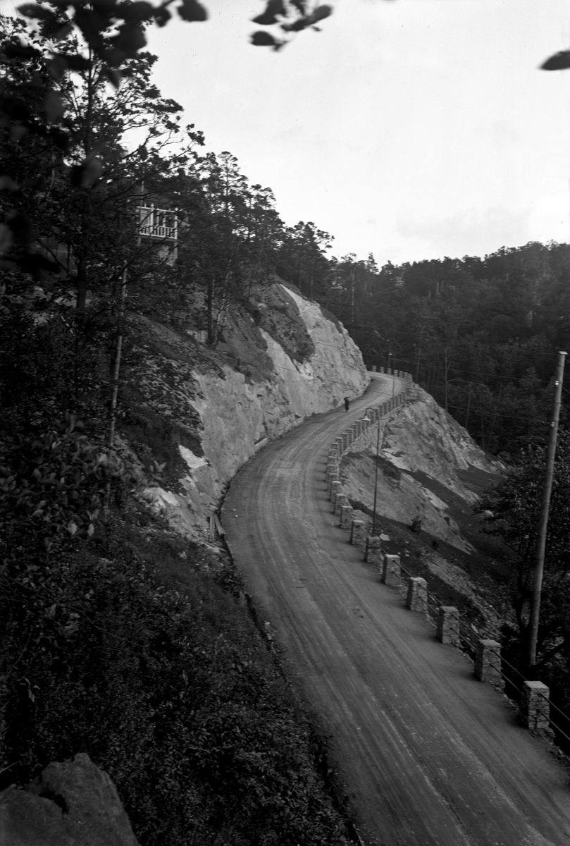 År 1924-07-08. Ådalsvägen i Huskvarna med det branta berget nedanför paviljongen.