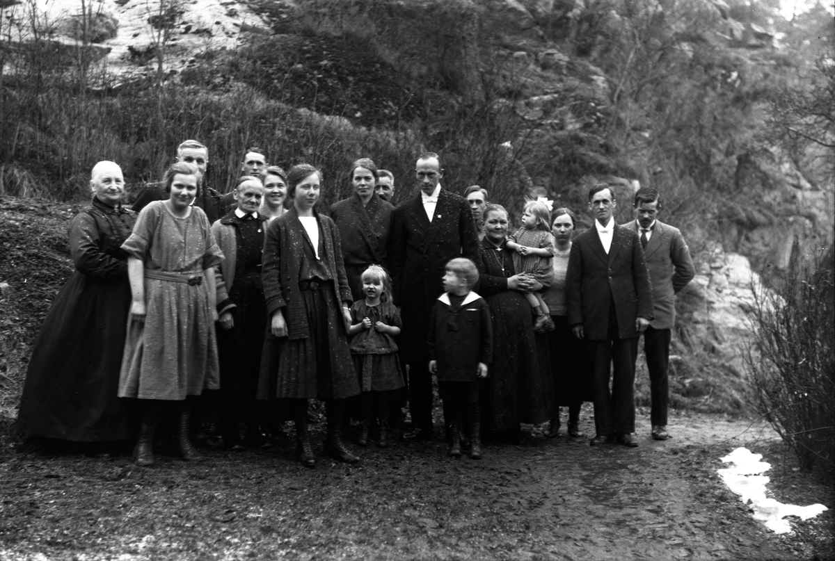 Familjen Hagstrand är uppställda för fotografering, lättklädda trots att det snöar.