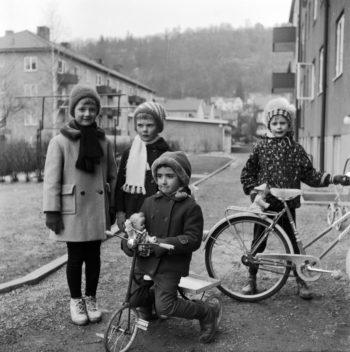 På gården vid Drottninggatan 18 i Huskvarna leker fyra flickor, en sitter på en trehjuling och en står vid en tvåhjulig cykel.