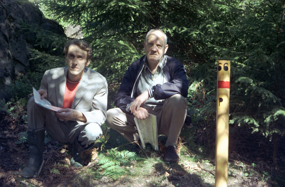 Olle och Sture Lindström i skogen med karta i handen. De sitter på huk framför en stor gran bredvid en gul stolpe markerad med rött och 66 P.