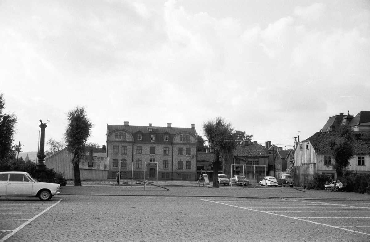 Bebyggelse vid Östra Torget i Jönköping. I förgrunden parkeringsplatser och en lekplats med gungor, gungbrädor och en rutschkana.