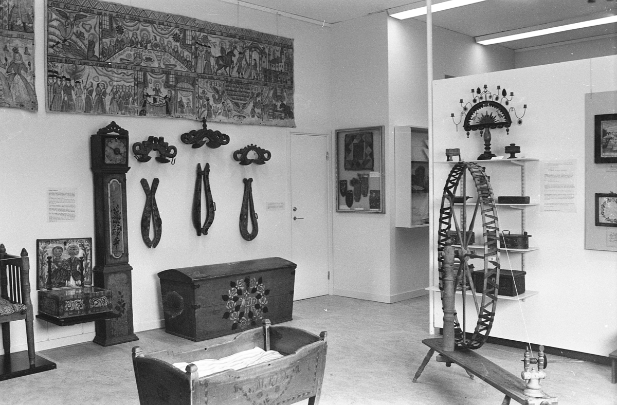Titel: Jönköpings läns museum, utställningar. Folkkonst med föremål tillverkade av den som skulle använda den. Västsmåländska väggbonader som ofta målades av kringresande bonadsmålare.